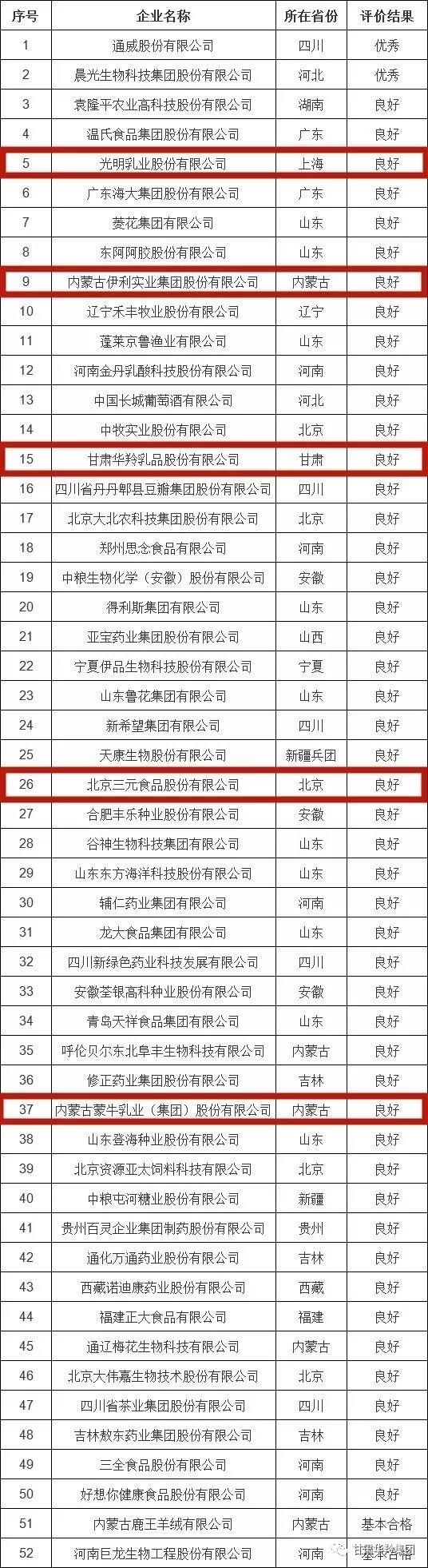 此次公布的52家企業名單中5家乳制品生產制造企業分別是光明乳業股份有限公司、內蒙古伊利實業集團股份有限公司、甘肅華羚乳品股份有限公司、北京三元食品股份有限公司、內蒙古蒙牛乳業(集團)股份有限公司,它們的得分依次是85.3、83.5、79.9、76.6、72.0 ,都被評為“良好”。詳細如下表: