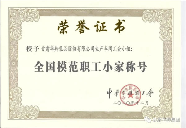 近日,甘肅華羚乳品股份有限公司工會在中華全國總工會2020年全國模范職工之家、全國模范職工小家、全國優秀工會工作者評選表彰中榮獲“全國模范職工小家”榮譽稱號。